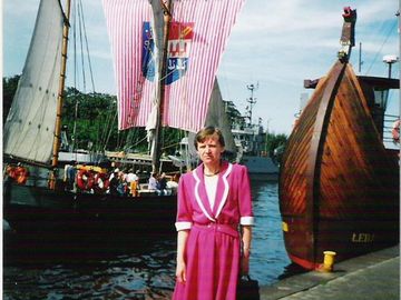 przy: ujściu Parsęty do Bałtyku, stąd wypływają stateczkami, kutrami chętni do przejażdżki - spaceru po morzu /a bander tam Ci dostatek, prym wiodą pirackie i (Kołobrzeg)