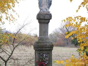 przydrożna kapliczka słupowa z figurą Matki Bożej na cokole. Figura przedstawia Matkę Boską, która stoi na kuli ziemskiej, którą opasuje wąż. Dwukondygnacyjna, na płycinie poniżej: przytwierdzona postać Chrystusa Ukrzyżowanego - na skraju wsi od Bukowska, za - słabo widoczny - fragment Lasu Bucznik, wcześniej przysiółek Sanoczki.