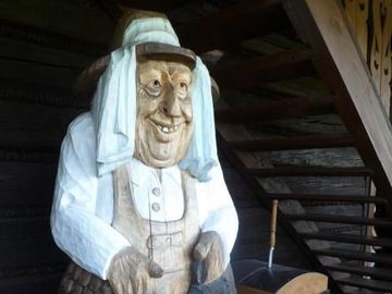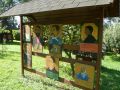 pszczelarz - uradowany a niżej na jego uniformie prezentowany - po lewej św. Ambroży - patron pszczelarzy i bartników no i misiu - co też na miodach się zna i c (Biała Niżna)