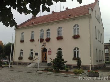 Ratusz miejski w Rynku, z herbem miasta nad wejściem.