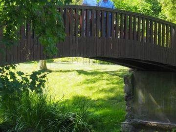 reprezentacyjny arkadowy mostek nad potokiem łączącym stawy w parku dworskim.