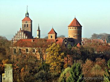 Reszel-Zamek Biskupów Warmińskich i kościół św. Piotra i Pawła-widok od wschodniej strony dwóch największych zabytków Reszla. Przed nimi znajduje się reszelski park od wschodniej i południowej strony Starego Miasta. 2011-12-05