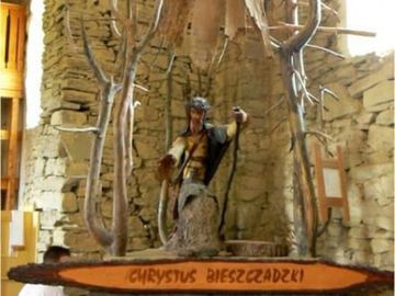 różne, czasem przedziwne uposażenie świątynie mają - czasem "bogate", marmurowe, złocone, diamentami akcentowane - a tak jest w cerkwi w Łopience, tak ! - dzięki artystom, pątnikom, klimatom ... /jakby "oni z innej gliny byli ! /... n/z rzeźba "Chrystus Bieszczadzki" - umieszczona tu w 1997r., dzieło Kamila B. - artysty z Nowego Sącza.