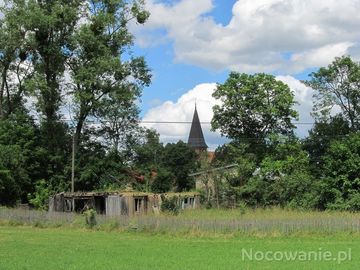 Ruiny spalonej chaty i dalej wieża kościoła