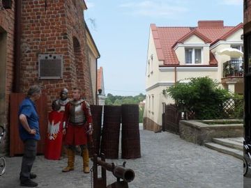 rycerz prezentuje pancerz - przy Zbrojowni Rycerskiej Chorągwi Rycerstwa Ziemi Sandomierskiej. (Sandomierz)