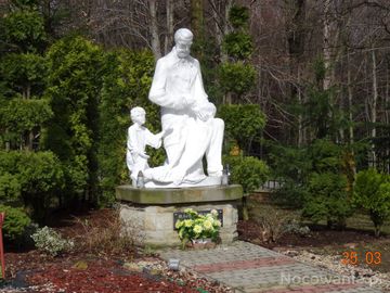 rzeźba przedstawiająca bł. Edmunda Bojanowskiego - założyciela Zgromadzenia Sióstr Służebniczek, udzielającego wspomożenia potrzebującej matce z dzieckiem.