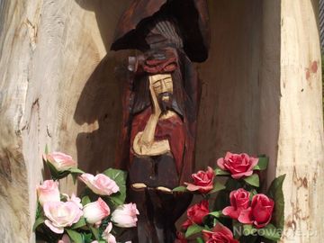rzeźba przedstawiająca Chrystusa Frasobliwego - będąca ubogaceniem kapliczki - przed wejściem na skansen / do zagrody p. Tomka Kędry.