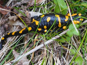 salamandra plamista - jaszczur ognisty - gody odbywa jesienią, głównie we wrześniu, młode - larwy są rodzone przez samicę w kilku miotach od marca do początku c (Liszna)