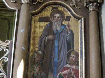 sceny biblijne - w ikonostasie, z akcentem przekazu historycznego : władcy Polski z częścią Rusi ofiarowują swe poddaństwo pod chrześcijańskim krzyżem.