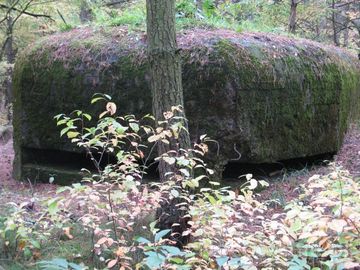 Schron nr 11. Fortyfikacje PRZEDMOŚCIE BYDGOSZCZ. W schronie tym znajdowało się dowództwo odcinka obrony. Widok schronu od strony szczelin obserwacyjnych. (Osowiec)