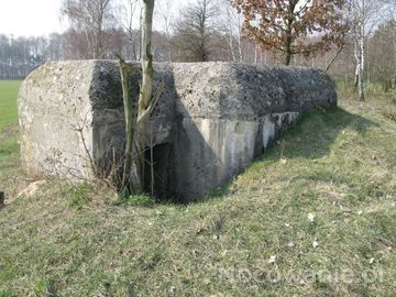 Schron nr 2 Armii "Poznań". Tradytor jednostronny. Położony wśród pól niedaleko wsi Słupy. Widok od strony przelotni, oraz wejścia do obiektu.