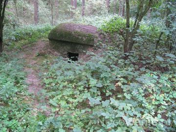 Schron nr 3. Armii "Poznań". Obserwacyjno - bojowy. Widok ogólny obiektu - od strony leśnego duktu, prowadzącego w kierunku schronu.