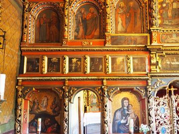 ściana ikonostasu - fragment po lewej, widoczne wrota diakońskie - tam przejście do prezbiterium cerkiewnego i po okrążeniu wyjście przez drugie wrota.