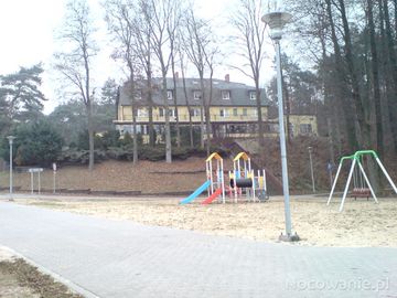 Sępólno Krajeńskie - hotel i restauracja "Jan" oraz fragment plaży miejskiej z placem zabaw dla dzieci.