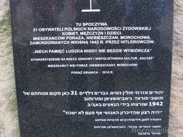 siedmioramienny świecznik - menora - symbol judaizmu - na tablicy informującej na macewie - zbiorczej jakby - pomniku. (Poraż)