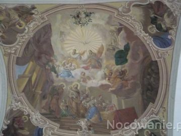 Sklepienie kościoła żaglaste zdobi polichromia z XVIIIw.na zdjęciu centralna część tej polichromii.