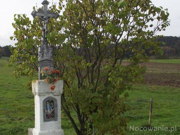 ślady wiary i kultury żyjących tu niegdyś - później zazwyczaj przesiedlonych - krzyż na postumencie a w niszy oszklonej figura Matki Boskiej a niżej złożone medaliony, będące pewnie kiedyś ubogaceniem / składową innych kapliczek czy przydrożnych krzyży.