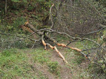 ślady żerowania bobrów, powalone drzewo - dokładnie pod kątem - nie inaczej ! - wszystko z zasadami sztuki inżynierii wodno-szuwarowej i bagiennej - od zawsze i (Myczków)