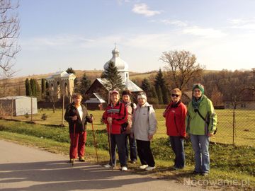 słuchaczki / studentki Uniwersytetu Trzeciego Wieku w Sanoku - po zejściu ze zbocza porosłego Lasem Gonszczawa i wejściu do wsi, tu : przed kościołem.