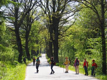 spacer w cieniu alei drogowej - ruch kołowy tam znikomy, sporo rowerów, jak na załączonym obrazku : prym wiodą piesi seniorzy.