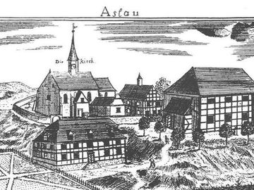 Stara rycina przedstawiająca centrum wsi.  (Osła)