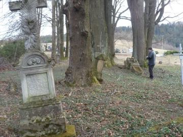 stary cmentarz - starych tu mieszkańców, byli wyznania grecko-katolickiego, po ustaleniu nowych granic państwowych w 1951r. byli przesiedleni na tereny ZSRR - dzisiejsza Ukraina, trudno było stamtąd wrócić. Cerkiew przeznaczono na magazyn a wieś zasiedlono osadnikami z Małopolski, Świętokrzyskiego, Lubelskiego - chcieli kościoła - przekazano im cerkiew, założono nowy cmentarz...