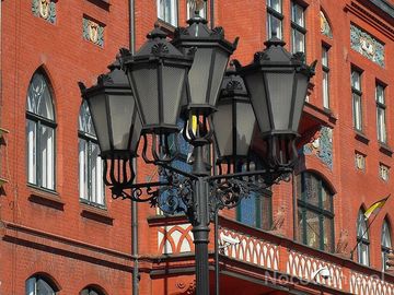 Stylizowana lampa uliczna na tle budynku administracyjnego. Prawda że urocze? (Chojnice)