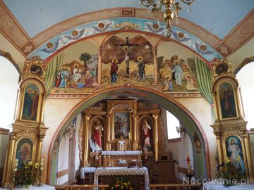 świątynia służy jako kościół, n/z łuk tęczy zamknięty półkoliście, narożniki nawy ścięte, tu po remoncie z naniesieniem nowej polichromii, w tej galerii są zdjęcia przed tymi pracami - polecam wgląd.
