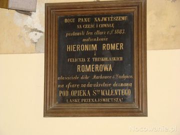tablica fundacyjna ołtarza św. Walentego przez Hieronima Romera i Felicję z Truskolaskich 1883.