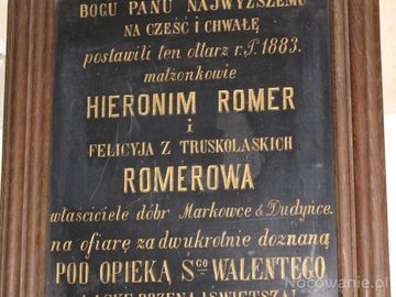 Tablica fundacyjna ołtarza św. Walentego przez Hieronima Romera i Felicję z Truskolaskich - 1883r. (Dudyńce)