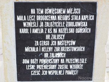 tablica na obelisku a na niej wspomnienie fundatorów kaplicy a później kościoła zdrojowego.