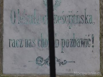 tablica wotywna na postumencie z figurą Matki Boskiej Przedziwnej - statua z 1891 roku, wyżej fragment ornamentyki - wici roślinnej ze wstążkami, w treści : "O lekarko chrześcijańska...
