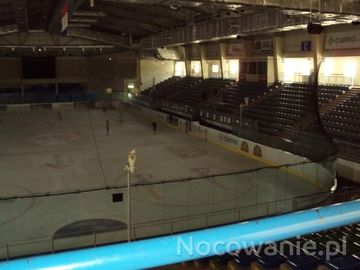 tafla lodowiska i fragment sektorów dla kibiców hokeja - Hala Widowiskowo-Sportowa "ARENA - SANOK".