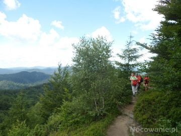 to już końcowy etap podejścia do szczytu góry Dwernik Kamień - 1004m npm, po lewej n/z urwiste, skaliste zbocze, niebezpieczne przejście tą ścieżką, hen pokryte lasami bieszczadzkie pasma, na południe : Smerek i Połonina Wetlińska.