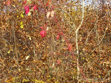trzmielina pospolita z rodziny dławiszowatych - jaskrawe owocostany, po lewej leśnego duktu przez Las Gonszczawa. (Końskie)