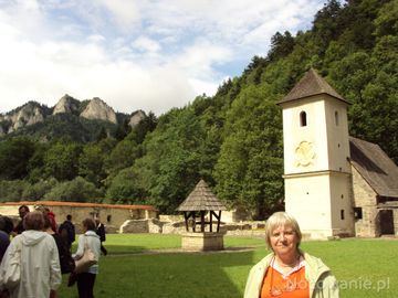 "Trzy Korony" - podpatrzone /przemycone/ z dziedzińca Czerwonego Klasztoru - Monastyru, na murach wieży - gnomon - zegar słoneczny, przy parkanie - ślady, pozostałości murów klasztornych cel mnichów tego monastyru ze wskazaniem przewodnickim na celę i urząd / kancelarię igumena - przełożonego zakonników - ojców i braci - tego zakonu.