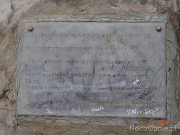 "Trzy po trzy" - autor Aleksander Fredro, tu na tablicy fragment. Ród Fredrów, jak i on sam, związany był z Ziemią Sanocką, w której mieli majątki, m.in. w Cisn (Glinne)