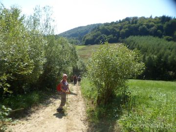 tu etap na : "Szlaku starej osady za lasem" podczas "wyprawy odkrywców" - tu już zejście do Muzeum Przyrodniczo - Łowieckiego "Knieja". W dole - n/z w zakrzaczeniu - potok Jasielnica, woda w nim krystalicznie czysta, w linii brzegowej czytelne tropy i ślady zwierzyny leśnej przy wodopoju.