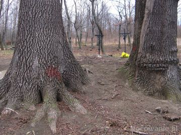 tu niegdyś : na wzgórzu cerkiew stała - po wysiedleniu mieszkańców wsi - została rozebrana w 1955r. Zachowały się słabo czytelne ślady podmurówki o wymiarach ok. 14 x 6 m oraz kilka nagrobków, nie wiemy co te rdzawe plamy na drzewach oznaczają - czyżby....? nie należy zakłócać spoczynku wiecznego !