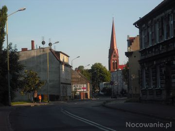 Ulica Grunwaldzka i kościół na starym mieście w Policach (Police)