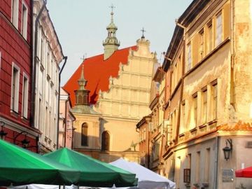 Ulica Zlota i klasztorny kosciol O. Domunikanow pw. sw. Stanislawa. Za datę pierwszej fundacji kościoła klasztornego przyjmuje się rok 1253. Obecny kościół został zbudowany z fundacji Kazimierza Wielkiego w 1342 r