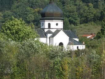 w bizantyjskim barokowym stylu - kiedyś : cerkiew filialna pw. św. Jerzego /św. Jura/, od 1947r. kościół fil. rzymsko-kat. pw. MB Częstochowskiej, a ten widoczny mur kamienny to tyle zostało po spichlerzu dworskim z 1-szej poł. XIX wieku, dwór spłonął w 1947 roku.