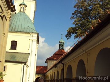 w centrum zespołu klasztornego - obok: po prawej - Wieczernik. Krużganki klasztorne służyły niegdyś pielgrzymom za miejsce prowizorycznego noclegu. Kalwaria ma (Kalwaria Zebrzydowska)