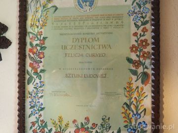 w chałupie na zagrodzie artystki - prezentowany dyplom za twórczość ludową. Każda gospodyni stawiała sobie za punkt honoru, by własnoręcznie i jak najbarwniej przyozdobić stary drewniany dom rodzinny, rywalizacja zaczęła się podobno od pieców, które były tu malowane w kwiatowe wzory. Z czasem kwiaty zeszły z pieców na ściany i dalej na zewnątrz - po całym obejściu.