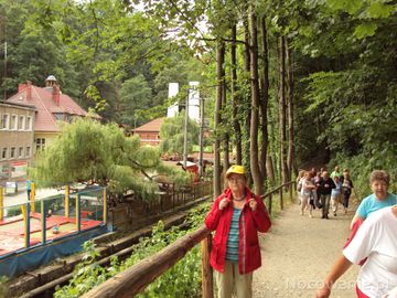 w dole po lewej : Muzeum Górnictwa i Hutnictwa a dalej do zwiedzania sztolnia dawnej kopalni złota, tu zaś w drodze do Leśnego Parku Przygody "Skalisko" - tam rodzaj "powietrznego trekkingu" na który składają się balansujące pomosty, pajęcze sieci, skoki Tarzana, kilkaset metrów tyrolek czyli zjazdów na linach rozpiętych między wzgórzami - tam też wydzielona specjalna trasa dla dzieci.