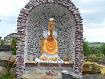 w grocie kamiennej - figura Matki Bożej Saletyńskiej, poniżej pisemna deklaracja wiernych nawiedzających to miejsce, przy temacie : zapraszam do galerii m. Dęb (Tylicz)