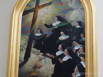 w kaplicy klasztornej : obraz przedstawiający Siostry Nazaretanki przy krzyżu. Niegdyś - a było to 1 sierpnia 1943r. w Nowogródku /obecnie Białoruś/ 11 Sióstr Nazaretanek oddało swe życie za aresztowanych członków rodzin - zostały rozstrzelane przez faszystów. Zaliczone w poczet błogosławionych przez Jana Pawła II 5 marca 2000r. - jesteśmy u Sióstr Nazaretanek i tu ten obraz.