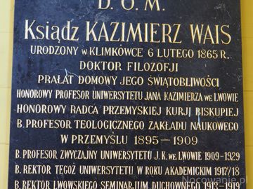 w kruchcie kościoła : tablica - ku pamięci księdza Waisa. Jest wyróżniony wpisem w wykazie "Najsławniejszych i zasłużonych postaci dla ziemi rymanowskiej", - wi (Klimkówka)