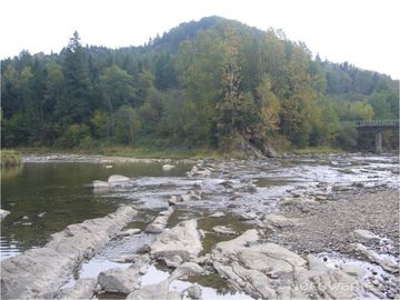 w m. Procisne potok Wołosaty - nad nim most /na zdjęciu: po prawej/ a z lewej rzeka San wpływa - tam nad wodami, na linii brzegowej bociana czarnego zobaczyć mo (Wetlina)