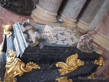 w Mauzoleum Piastów świdnicko-jaworskich - sarkofag książęcy Bolka I Surowego, w pobliżu drzwi wiodących na cmentarz górny, strona północna. (Krzeszów)